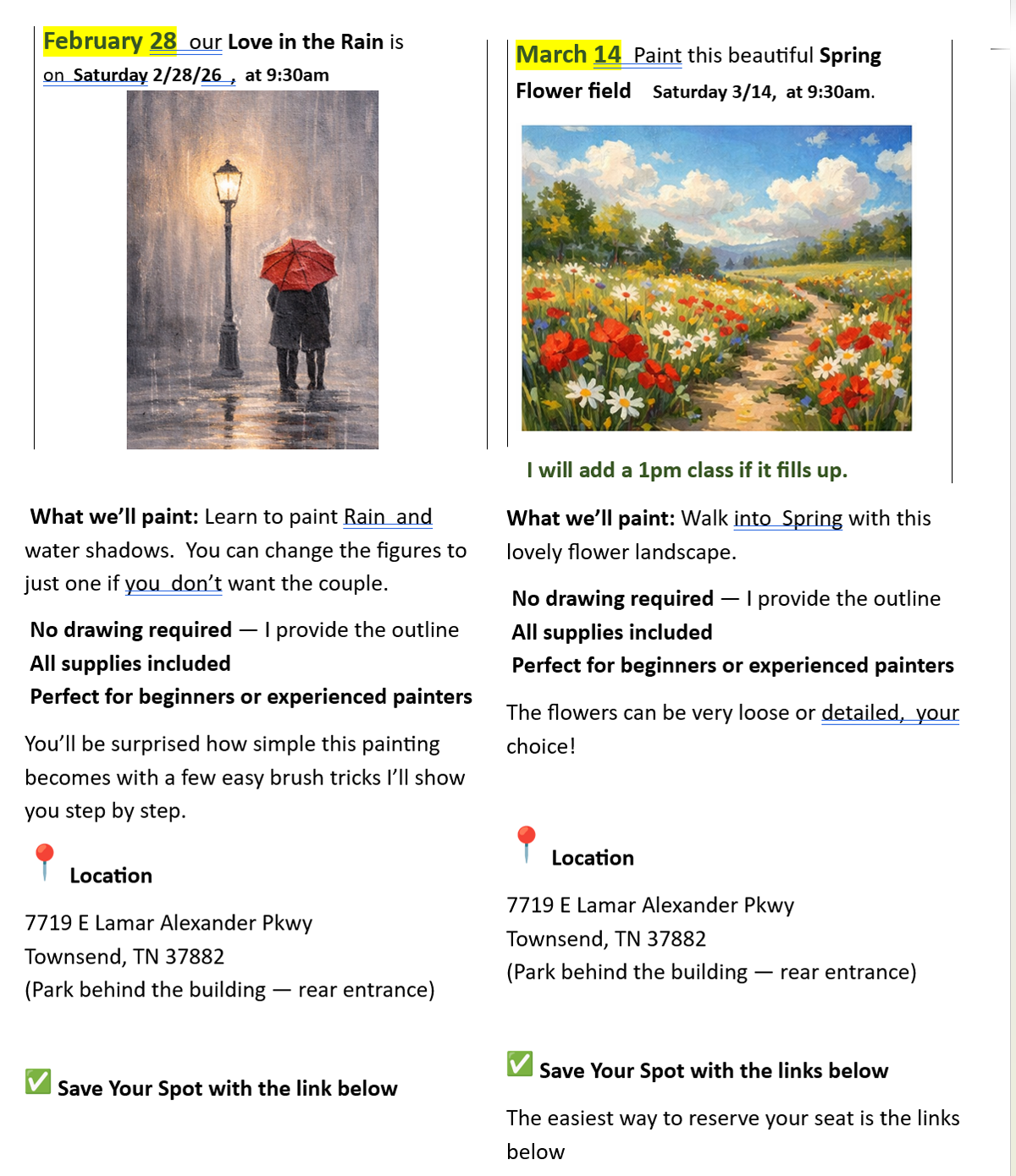 My teaching style is easygoing and encouraging — perfect if you’ve always wanted to paint but felt unsure